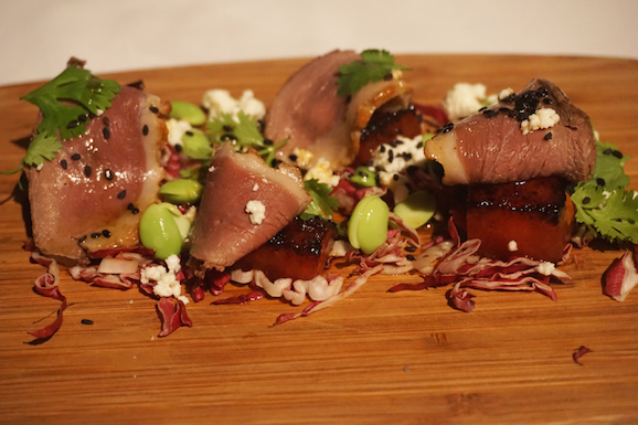 Above: home-cured duck breast with feta, glazed watermelon, radicchio and edamame