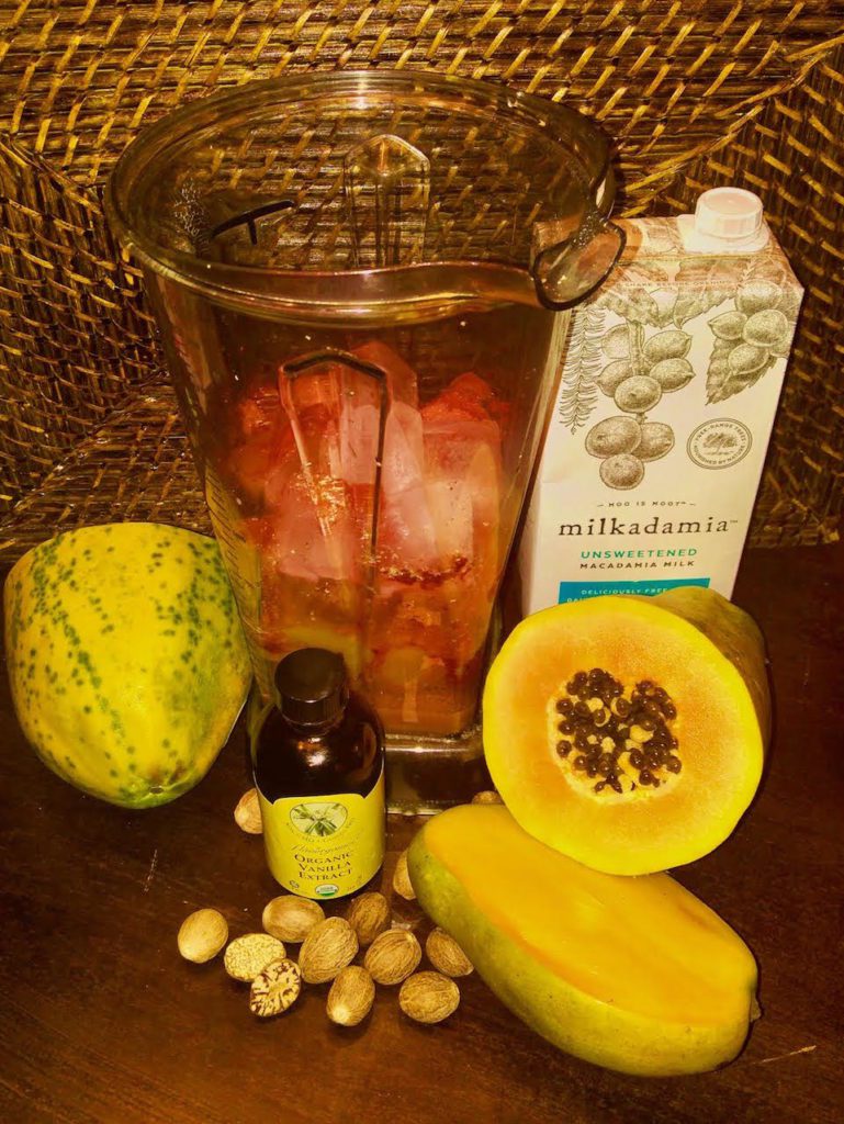 However, as a tribute to my Dad for Father’s Day and in combination with the National Food months mentioned above, I want to share with you today a special fruit punch blend originally concocted by my father. If you dislike the taste of fresh papaya as I did then, you will enjoy it this way, I promise. Even my sister who thought papaya smelled like cheesy feet could not get enough of this drink – another of Dad’s “claim to fame”.